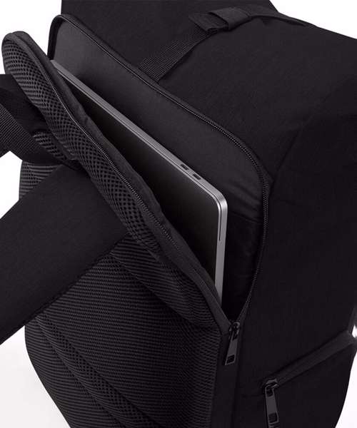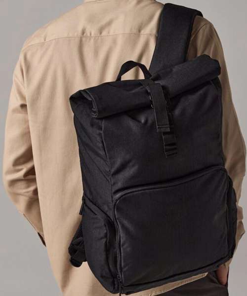 TearAway label for ease of rebranding. Laptop compatible up to 15.6". External access padded laptop compartment. Secure roll-top and clip closure system. Discrete zippered back panel pocket. Front pocket organiser section. Internal slip pocket. Multiple internal pockets. Power bank pocket. Integrated USB charging port. Zippered front pocket. Zippered side bottle pocket. Ergonomic padded back panel. Padded adjustable shoulder straps.