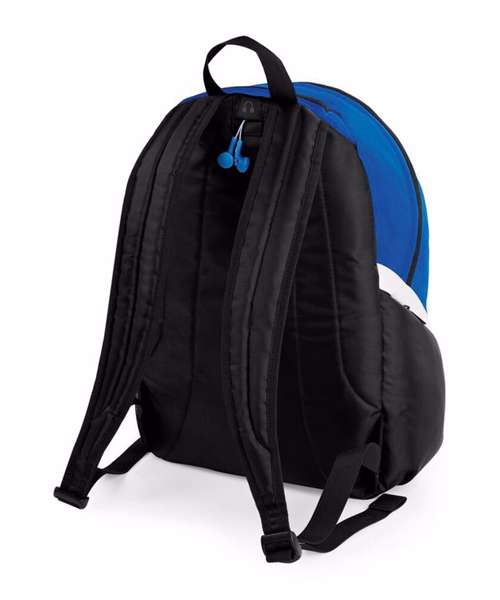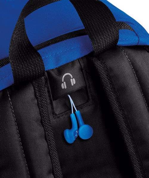 Wet pocket/match ball pocket. Zippered side pocket. Elasticated mesh side pocket. Plush lined media pocket and headphone port. Padded adjustable shoulder straps. Padded back panel. Grab handle.