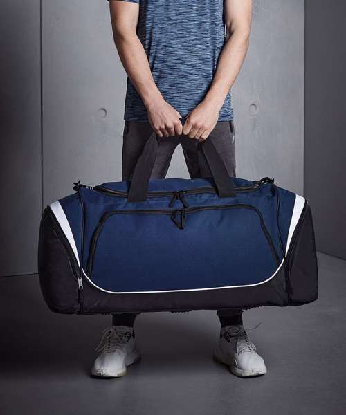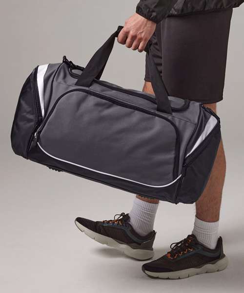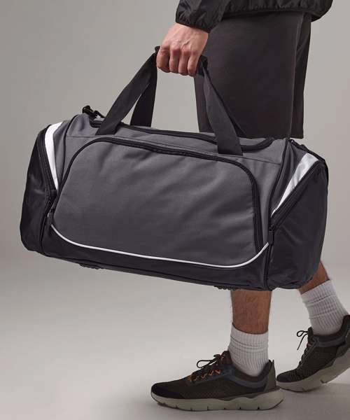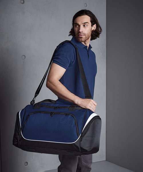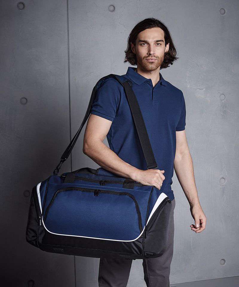 Detachable adjustable shoulder strap with pad. Shoe tunnel/wet pocket. Internal valuables pocket. Elasticated bottle loops. Zippered end pockets. Internal mesh pockets. Padded hand grip.