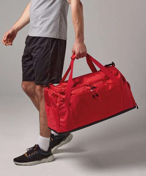 Contains 100% certified recycled polyester. Two-way zipped opening for easy access. Dedicated racquet pocket. Fits racquets up to approximately 23cm wide. Hockey stick sleeve with elastic retainer. Shoe tunnel/wet pocket. Zipped front pocket. Zipped rear pocket. Stretch mesh side pocket. TearAway label for ease of rebranding.