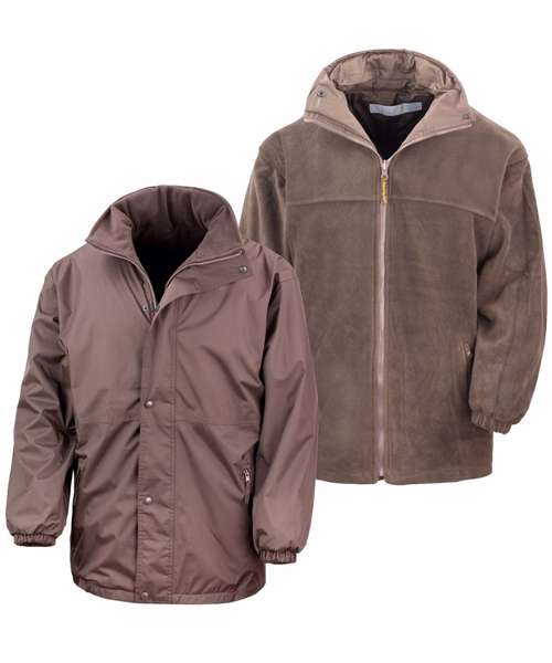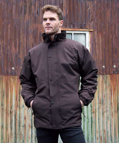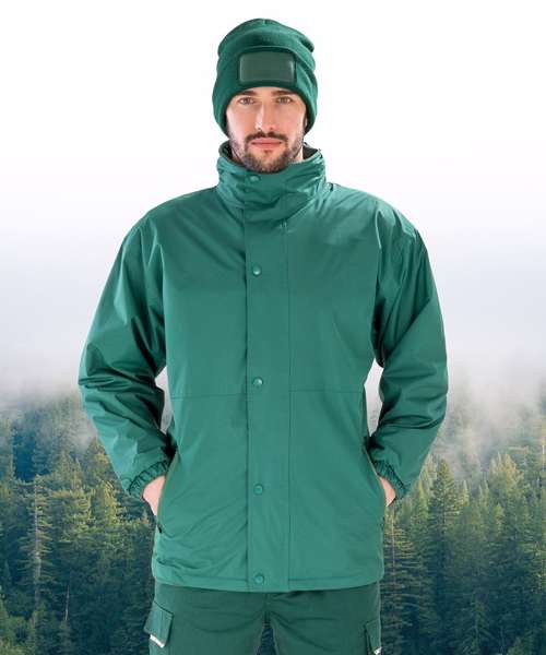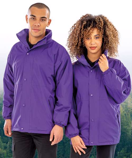 Reflective fabric outer hang loop. Heavy-duty full zip-through collar. Double-stitched taped seams. Stud closing outer storm flap. Concealed integral hood. Zip closing side pockets. Elasticated cuff. Stand-up collar. Inside pocket. Made with 100% recycled polyester.