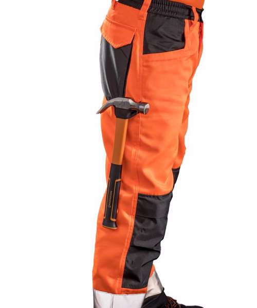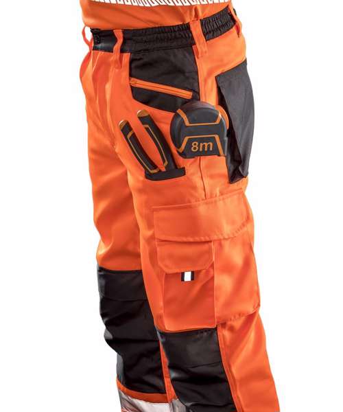 Partially elasticised waistband with belt loops. Front zip with button fastening. High rear comfort waistband. Rear patch and ruler pockets. Front slit and zip pockets. Black contrast panels. Bar tack stress points. Reflective Hi-Viz leg bands. Side cargo pocket. Kneepad pockets. Hammer loop. Generous fit. Ready to band cut away label. Tough and hardwearing with mechanical stretch. EN ISO20471:2013 CLASS 2. RIS-3279-TOM CLASS 2: Issue 2:2019 (orange only). Decorating methods: Embroidery. Decorators access point: Inside left chest and back hidden zips