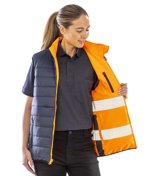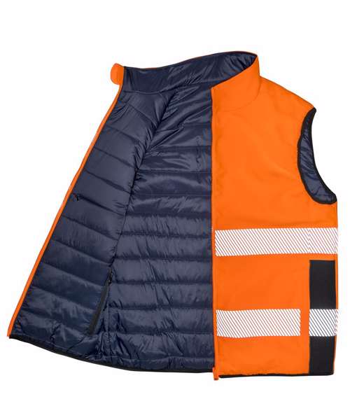 EN ISO 20471:2013+A1:2016 CLASS 2; RIS-3279-TOM (ORANGE ONLY). Lightweight and warm. Soft stretch. Printable. High visibility. Reflective safety body bands. Hang tag. Dark lower panel masks grime. Soft bound cuff. Stand-up collar. Quiet to wear. Zipped pockets. Ready to brand tag free. Decorating methods: Embroidery. Decorators access point: Hidden chest and back zips on navy side.