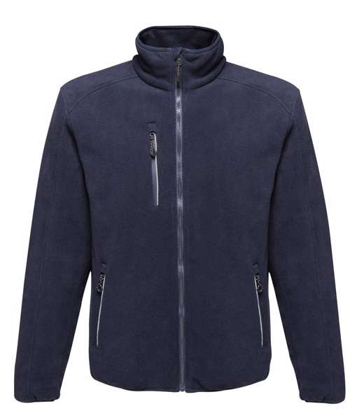 2 zipped lower pockets and 1 chest zip pocket with inner concealed zip in lining for embroidery access.
