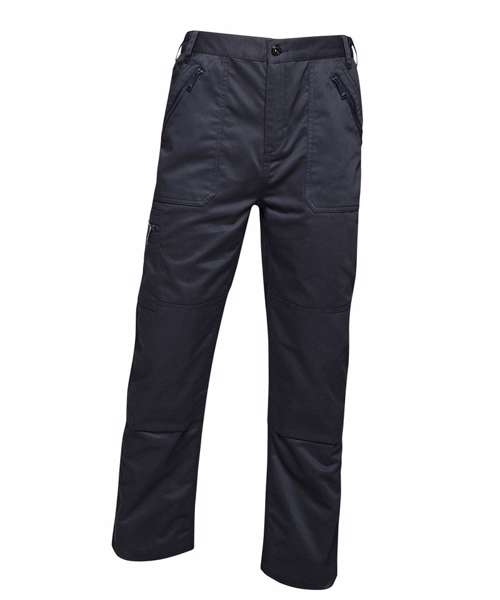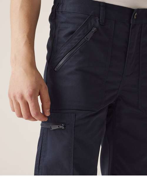 Hardwearing polycotton fabric with water-repellent coating. Multi zip pocket design with 8 pockets. Part elasticated waistband and triple stitched seams with reinforced crotch. Kneepad pockets compatible with Regatta kneepads.