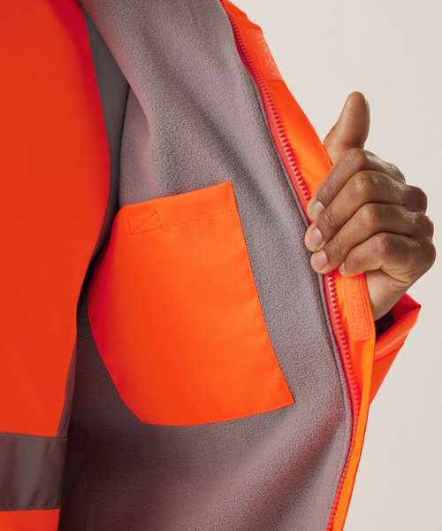 Waterproof Hydrafort 100% polyester Oxford 300D fabric. Certified to EN ISO 20471:2013 A1:2016 Class 3. Orange colourway also conforms to RIS-3279-TOM. Conforms to EN343 Class 3:1. 220 series anti-pill Symmetry fleece-lined body. Thermo-Guard insulation in sleeves. Made with recycled content. Waterproof taped seams. Two lower zipped pockets. Inner patch security pocket. Concealed hood with adjusters. Elasticated and adjustable cuffs. Elasticated hem. ID Reflection – angled chevrons inform whether you are facing forwards or away.
