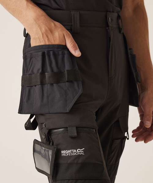 The Hi-Vis X-Pro Stretch holster trousers (Class 1) from Regatta Professional are a fusion of protective, hi-tech and unparalleled comfort. These meticulously crafted trousers embody a design-led approach, seamlessly blending style with functionality. Constructed from 4-way stretch and water-repellent fabric, they guarantee unmatched comfort, while the laser-cut design at the back knee enhances breathability during strenuous tasks. These work trousers will stand the test of time with their Cordura® fabric top-loading kneepad pockets. They feature a hammer loop and 15-strategically placed pockets for tools and an ID holder, while fluorescent fabric keeps you visible in low-light settings.