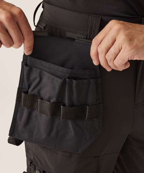 92% Nylon, 8% Elastane 4-way stretch fabric. Certified EN ISO 20471:2013 +A1:2016 Class 1. Heat-applied reflective tape, with segmented tape on strategic panels for additional comfort. Detachable holster pockets, with slide system for optional use. Cordura® top-loading kneepad pockets. Extendable hem offers a choice of leg lengths.15 pockets, multifunctional side pockets, back ruler pocket, ID pocket. Laser-cut ventilation to back of leg. Hammer loop. Elasticated underband with gel print detail. Triple-stitched seams and reinforced crotch for added durability. Slim fit design. Made with recycled content.
