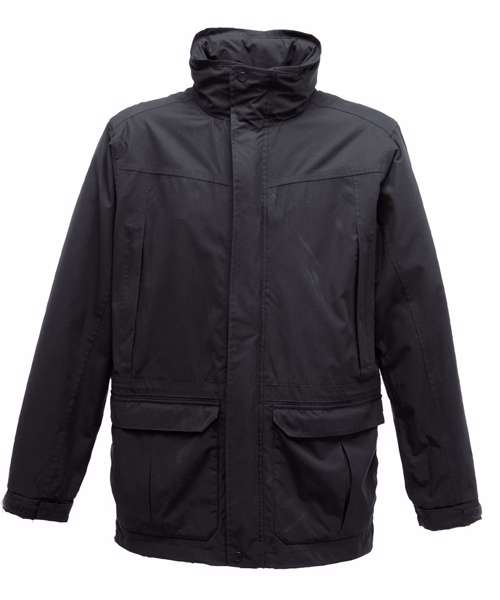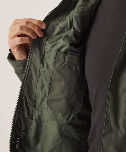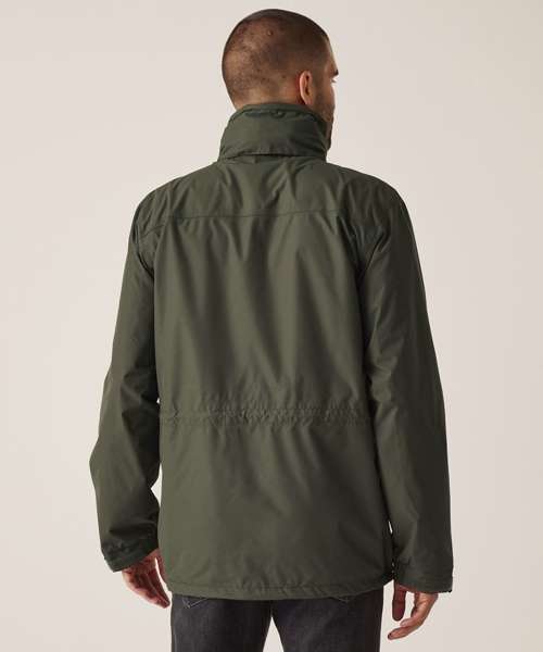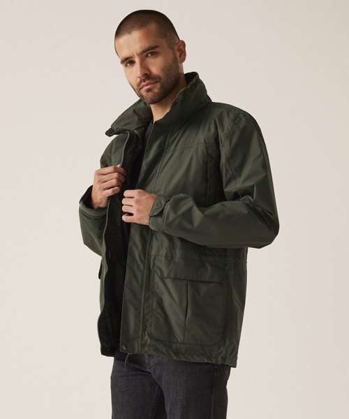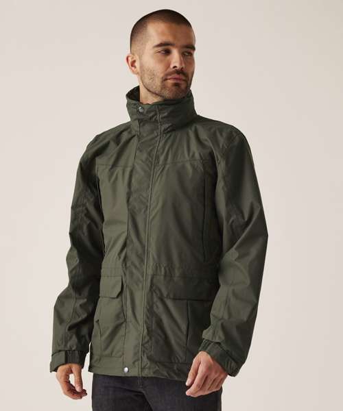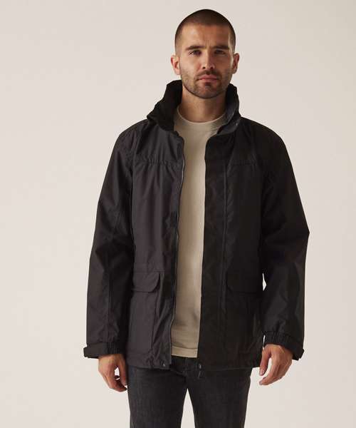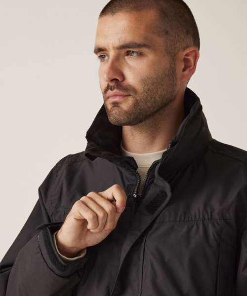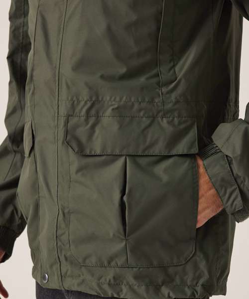 Waterproof and breathable Isotex 5000 coated polyester twill microfiber. Part mesh part polyester taffeta lined. Taped seams. Interactive Concealed hood with adjuster. Studded double stormflap. Adjustable cuffs. Internal map pocket. 2 zipped chest pockets. 2 lower patch pockets with side hand warmer entry. Internal mobile phone pocket. Adjustable shock cord waist and hem system. Internal zipped embroidery access.
