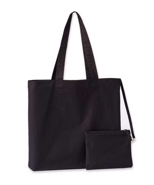 100% Certified recycled cotton, 200gsm. Wide canvas tote with connected cotton zip purse. The purse is detachable with a silver clasp. Concealed zip with self-fabric zip pull. Straps: 60cm x 3cm.