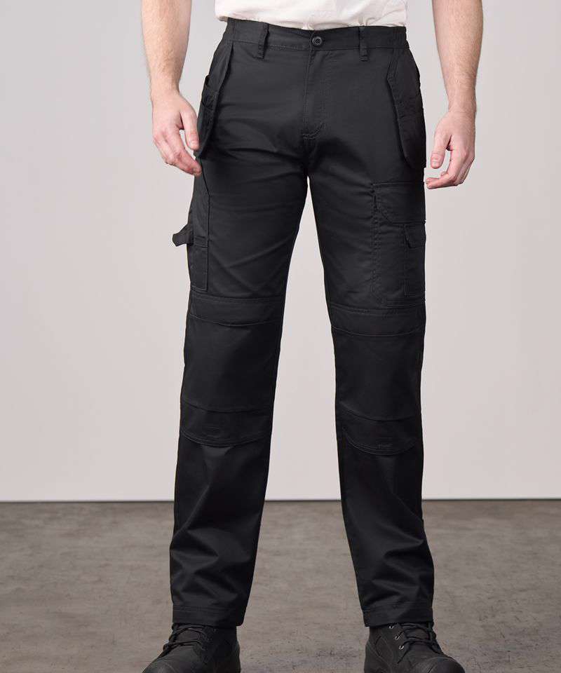 Zip fly front fastening. Part elasticated waist band with belt loops. Two side front tradesman pockets. Two upper leg utility pockets, right hand side ruler pocket, left hand side utility and phone pocket. External knee pad pockets with tear and release fastening. Two back patch pockets. Hammer loop. Twin-needle stitching on hem.