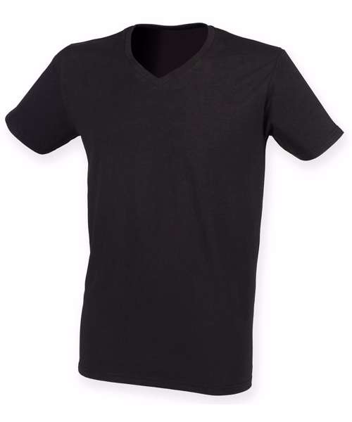 Feel good men's stretch t-shirt with enzyme wash for unique soft hand-feel. 96% cotton, 4% elastane for improved fit, comfort and shape retention. Modern long-line fit. V-neck with back neck binding and soft stretchy rib neckline. Features tearable removable label.