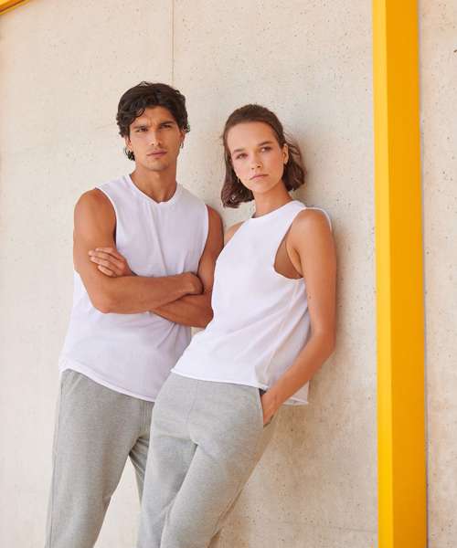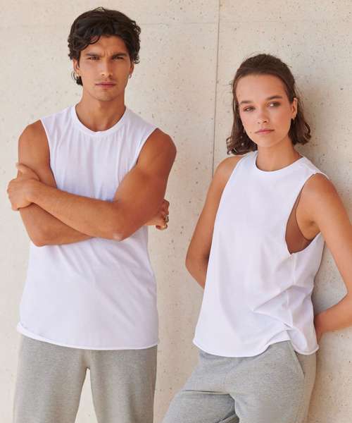 Fashion meets athleisure. Style and freedom to move with a stretchy ribbed crew neck and raw edge slash armholes and hem. Features tear-out label for easy rebranding.
