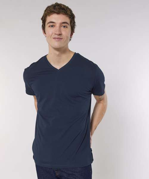 The men's v-neck t-shirt in 120gsm organic cotton features refined proportions and is designed with the perfect neckline and with a self-fabric construction.