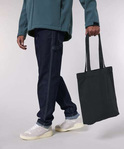 Top edge double folded for strength and clean finish. long handles with reinforced cross stitch. Shaping seam at bottom to create volume. Unisex. 80% recycled cotton, 20% recycled polyester. Canvas.