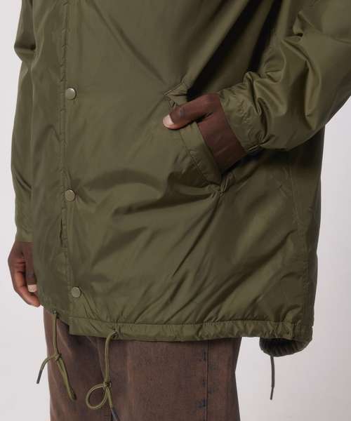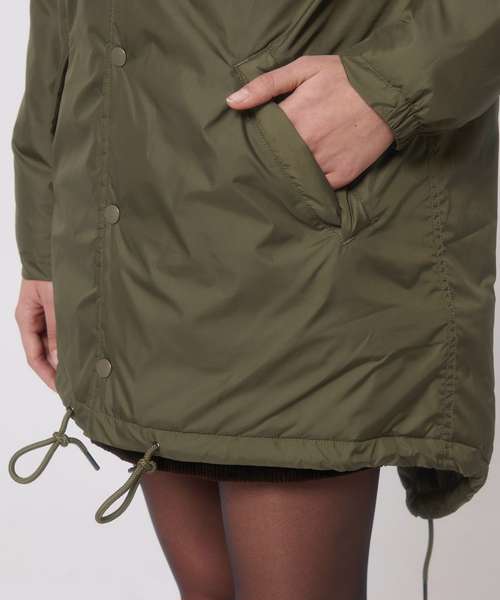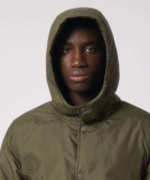 Unisex padded parka jacket. Set-in sleeve. Metal snaps at centre front. Welt pockets at front. Round drawcords at bottom hem. Semi-elastic sleeve cuff. Double layered hood with adjustable plastic stopper and elastic cord on inside. Diamond quilting on inside lining. Inside zip opening at bottom hem and wearer’s left chest for easy decoration.