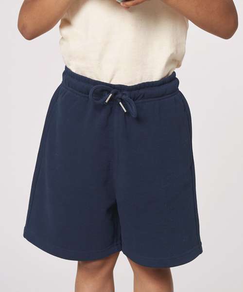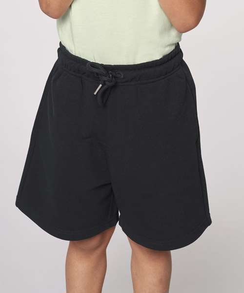 Kids jogger shorts. Self-fabric elastic waistband and round drawcords in matching body colour with metal tipping. Embroidered eyelets. Pockets at front. Patch pocket at back. Bottom hem with wide double-needle topstitch.