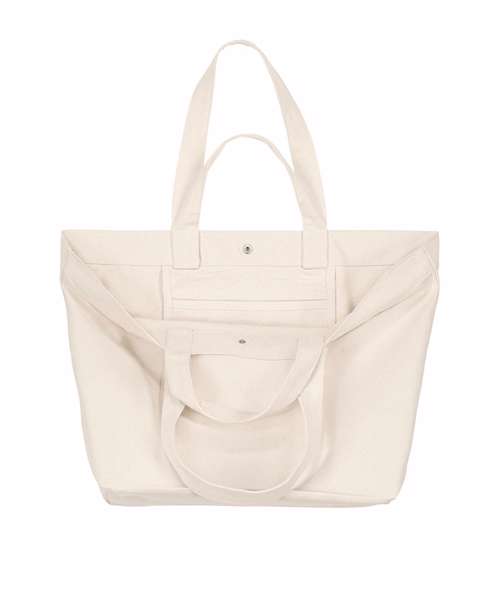 Woven shopping bag. Folded hem at top edge. Hidden snap closure. Bottom and side soufflé. Long and short self-fabric handles with cross-stitch for reinforcement. Inside self-fabric pocket. Herringbone tape on inside seams for a clean finish. Single-needle stitch at top edge.