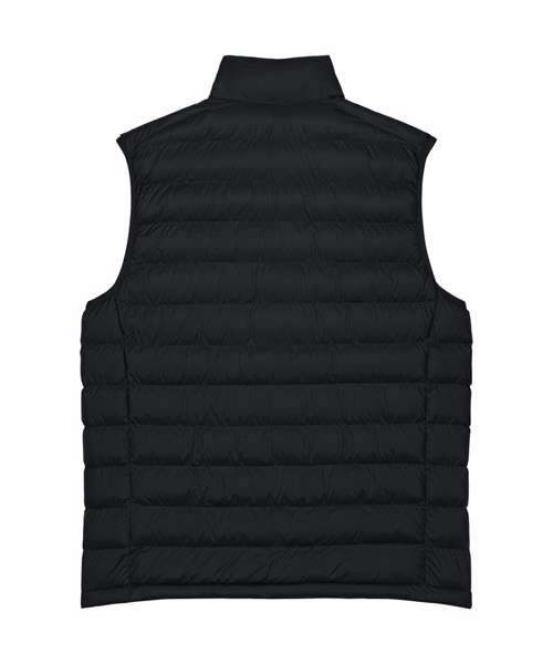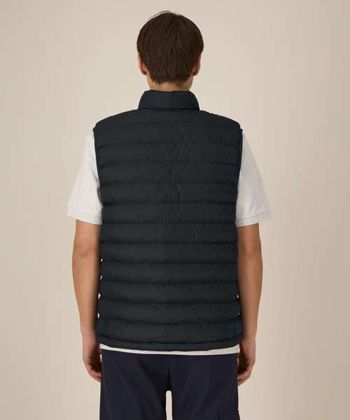 Men’s bodywarmer. Medium fit. Sleeveless. High collar. Reverse nylon zip at centre front. Zipped welt pockets with extra grosgrain puller. Elastic tape binding at the armhole. Fully quilted. Side panels for a better shape. Inside seams with binding finish. Bottom hem has an adjustable plastic stopper and elastic cord.