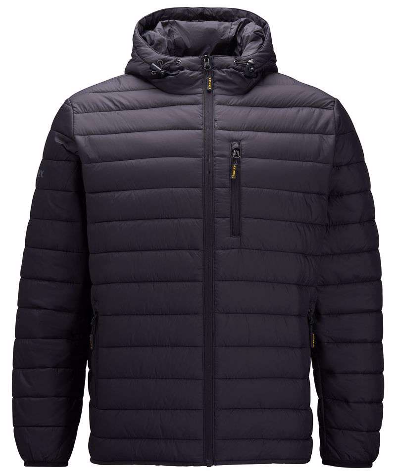 Insulated zip-through jacket with hood, chest pocket and narrow baffles. Water-resistant. Zipped pockets. UKAS certified. ISO certified.