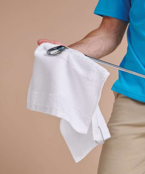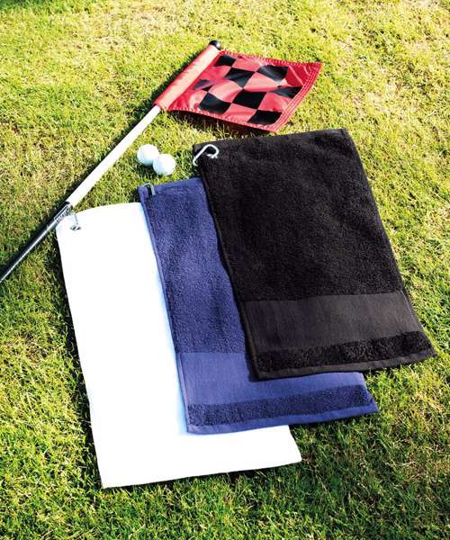 Heavyweight golf towel with deep pile and excellent absorbency. Featuring a wide border, perfect for personalisation. Finished off with a metal rivet.