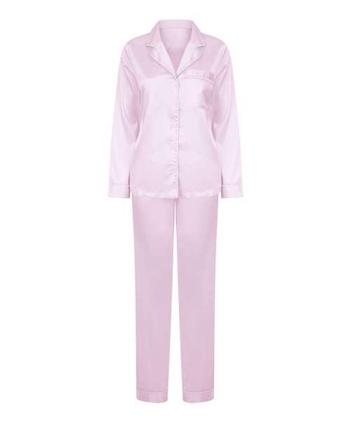 Stretch satin long sleeved shirt and long pants pyjama set. Centre front button fastening down the centre front. Front breast pocket. Contrast piping detail. Pants with elasticated waistband and self fabric drawcord.