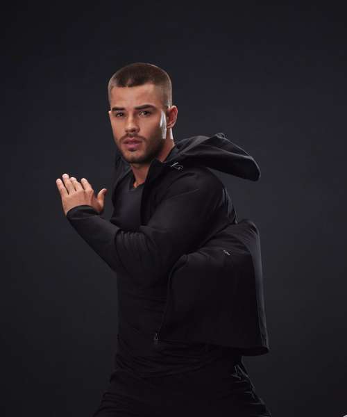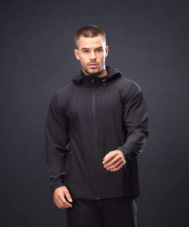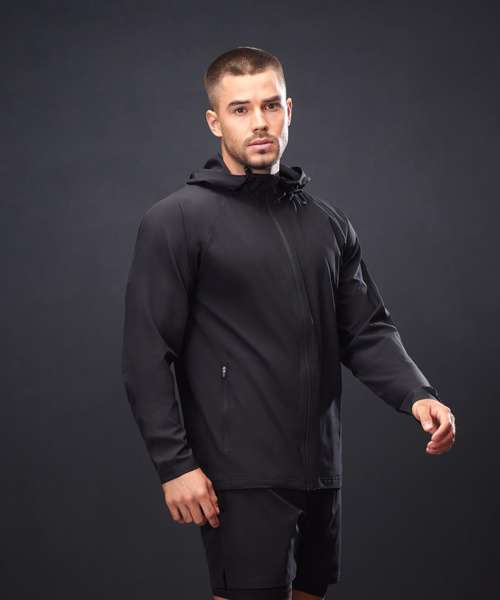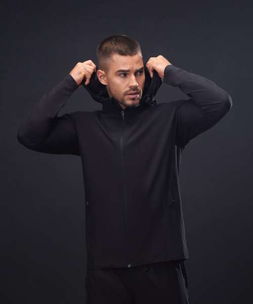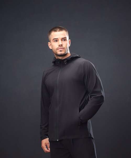 Unisex technical full-zip hoodie made from four-way stretch microfibre fabric. Unlined. Reverse coil zip with snap-down pull. Zip guard/inner flap at centre front. Raglan sleeves. Sports toggle pulls at the neck funnel. Three-piece hood. Zipped side pockets with self-fabric pocket bags. Dropped hem at the rear. Twin-needle stitched hems.