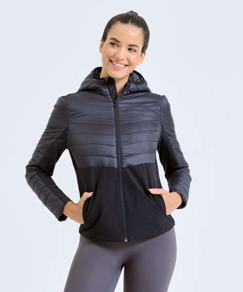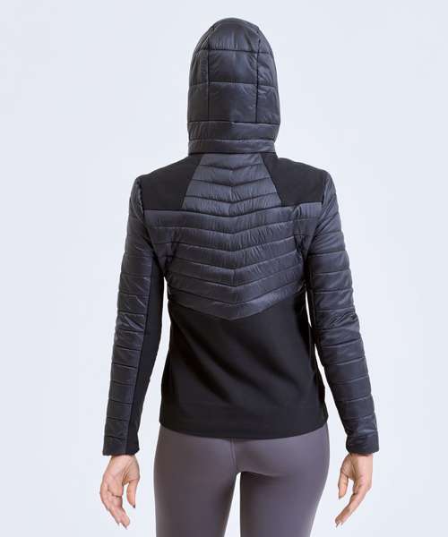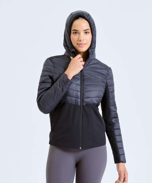 Stretchy shell panels on the sides and sleeves make this women’s TriDri® insulated hybrid jacket the perfect style for outdoor workouts. Lightweight, with quilted detailing, hybrids are designed to keep you warm by regulating body temperature. With internal storm flap and elasticated hood and sleeves, this jacket will protect you whilst training in the elements.