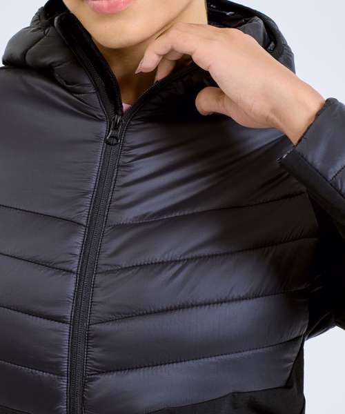 Hybrid jacket with diagonal quilted upper chest and back. Lower jacket is shell fabric. Full zip-through style with panelled hood. Hood is elasticated for a snug fit. Front pockets. Quilted detailing to arms with lower arm in shell fabric. Internal storm flap with zip guard. We recommend using block out vinyl and inks.Product contains no branded neck or waist label. Removable Kimble or looped garment tags. Inner seam label holds important product information on one label with a second label containing brand information which can be cut-away.