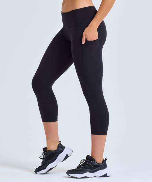 3/4-length leggings. Soft-stretch fabric. Elasticated waistband. Black inner waistband and coin pocket. Side panels to legs with hidden insert pocket. Recycled Polyester. We recommend using block out vinyl and inks.Product contains no branded neck or waist label. Removable Kimble or looped garment tags. Inner seam label holds important product information on one label with a second label containing brand information which can be cut-away.