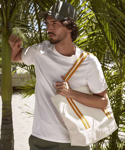 Contains 100% certified organic cotton. Premium, heavyweight fabric. Soft cotton, striped webbing handles. Can be carried by hand or over the shoulder.