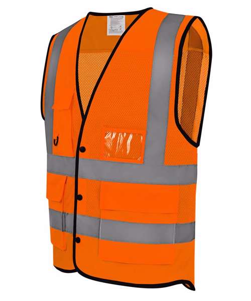 Conforms to EN ISO 20471:2013+A1:2016 Class 2 and EN ISO 13688:2013+A1:2021. Hi-vis Orange also conforms to RIS-3279-TOM. Proudly made of 100% recycled polyester. Super-cool open mesh around the body for comfort. Front button closure ensures quick release for enhanced safety. ID chest pocket with reinforced piping. Pen and mobile phone pockets, plus keyring. Two bottom pockets with top and side two-way access. Great size choices. Large decoration area for logos.