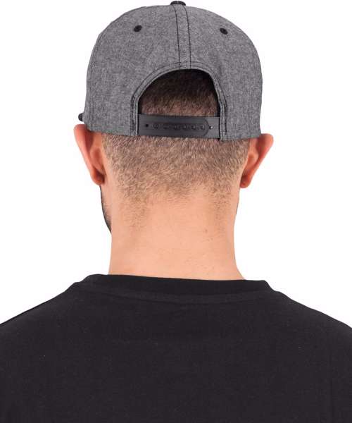 The chambray-suede effect gives this snapback an elevated style. The 6-panel cap with matching under visor features subtle details such as contrast eyelets and button and a tonal plastic snap.