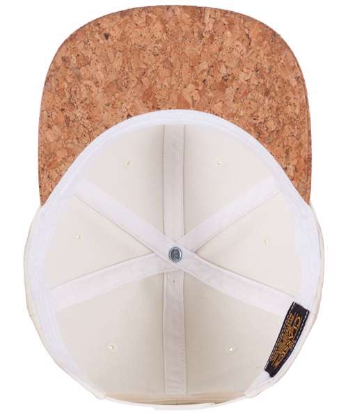 Cork snapback. Classic shape. Premium wool-blend. Matching plastic snap. Hard buckram. Cork visor.