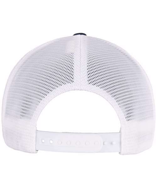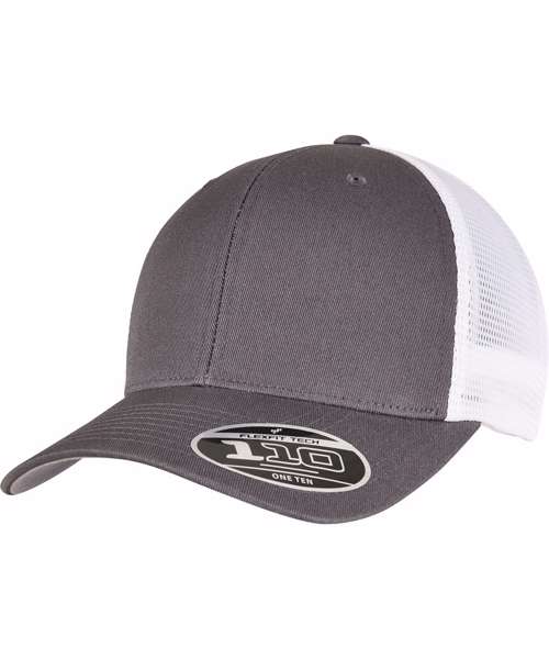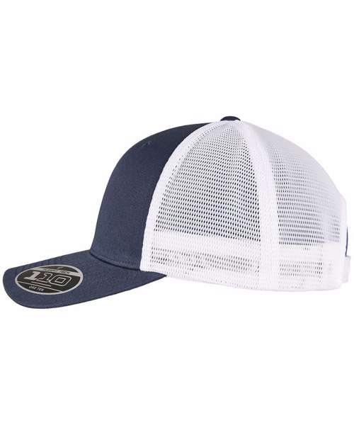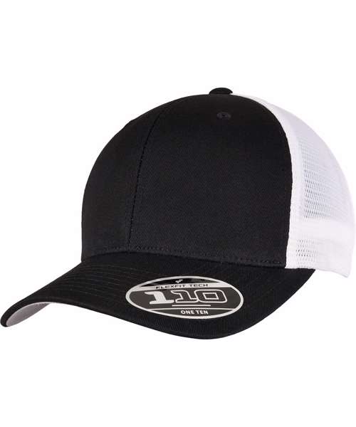 Two-toned trucker cap with adjustable, color-matching snapback closure, made of cotton and polyester, one size fits all, Flexfit 110 technology, 8-fold quilted, pre-bent visor.
